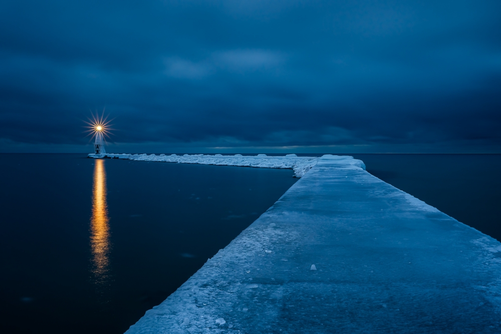 One of my favorite photos is “Frozen Passage”. It was taken in a sleepy little town called Frankfort on Lake Michigan shore in the winter.  When I arrived in a heavy snow storm, the entire resort had less than five guests. I am sure I was the only photographer in town. I scouted the area and waited for the gloomy sky to clear. Near the dusk of second day, I saw a glimpse of hope. There was a slim gap in the thick cloud at horizon towards west. I put on the ice cleats and headed out to the icy pier.